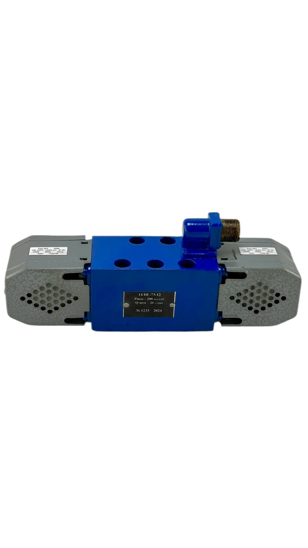 В распределителях 44ПГ73-12 и 45ПГ73-12 управление золотником осуществляется через два электромагнита и пружины, которые центрируют золотник при отключении питания. Для станочного оборудования используются электромагниты на 220В / 110В переменного тока, а для мобильной техники — на 12В / 24В постоянного тока. Газировка напряжения также указывается в конце маркировки: 44ПГ73-12 В220 (допускается 44ПГ73-12.220).