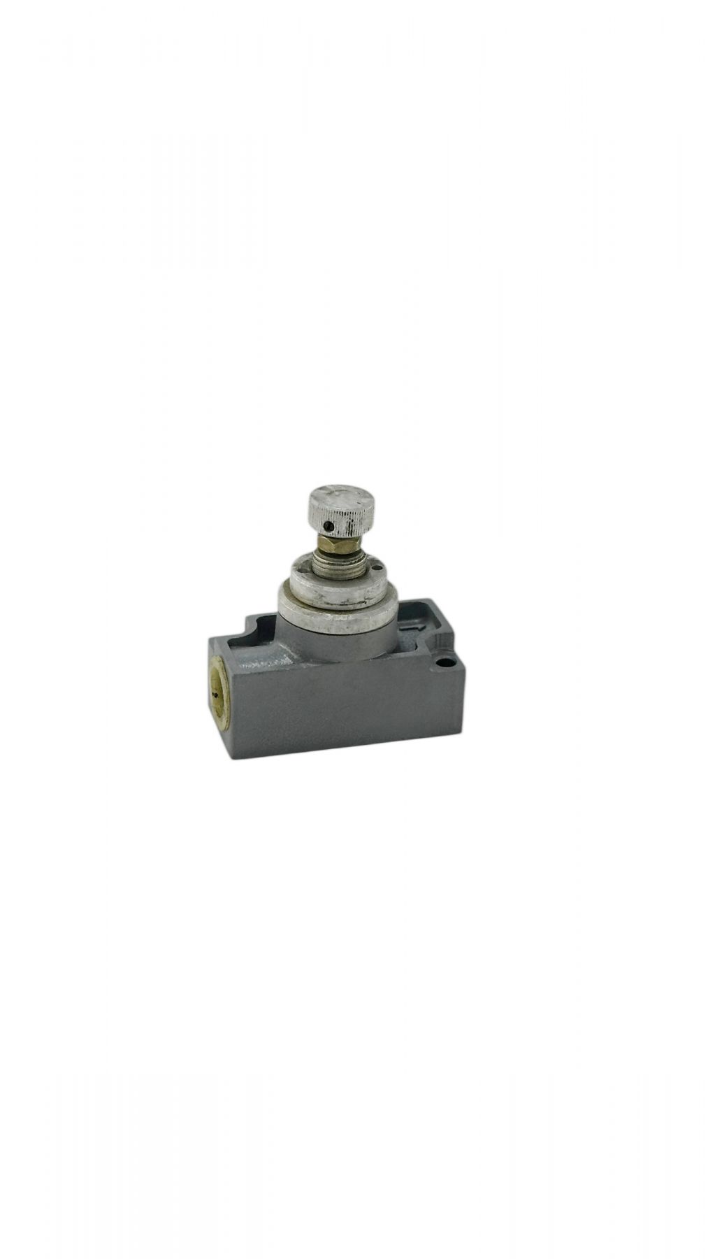 Настройка дросселя П-ДК под требуемый расход сжатого воздуха осуществляется поворотом регулировочной ручки, фиксирующейся гайкой. При изменении направления движения потока сжатого воздуха резиновая пневматическая манжета отделяется от посадочного седла в корпусе, что обеспечивает свободный проход воздуха в обратном направлении.