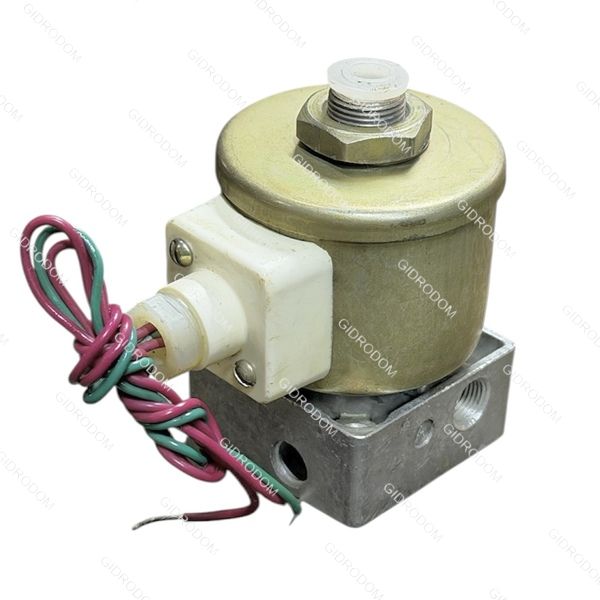 При подаче напряжения на электромагнит якорь, преодолевая силу пружины, смещается к упору, перекрывая выход в атмосферу и открывая канал, соединенный с отверстием подвода подачи воздуха. Воздух поступает в канал потребителя.
